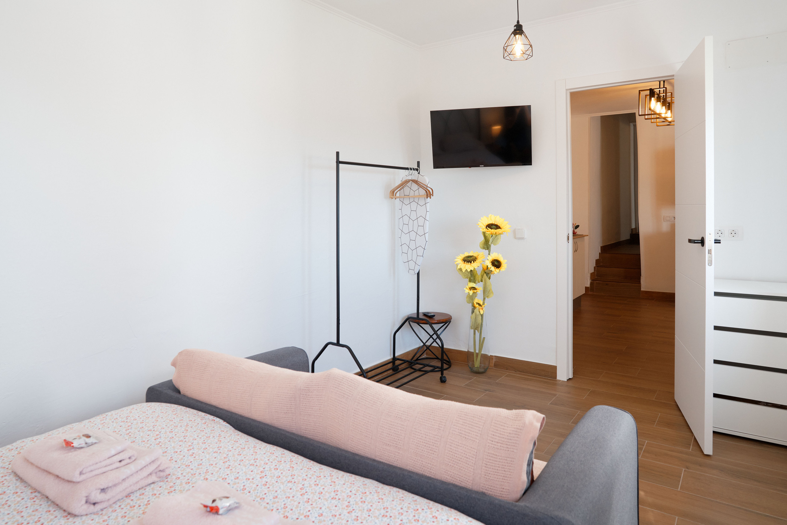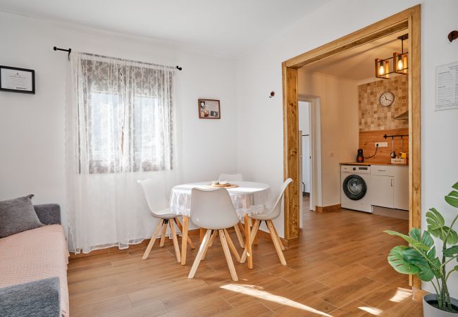 En el interior, el apartamento ofrece un diseño moderno, luminoso y funcional. El salón-comedor con cocina abierta está totalmente equipado e incluye Smart TV, sofá, zona de comedor, lavadora, cafetera Dolce Gusto, utensilios de cocina, nevera y microondas, pensado para que te sientas como en casa desde el primer momento. Dispone de dos dormitorios con camas dobles, armarios y una atmósfera tranquila para un descanso reparador. El baño independiente cuenta con ducha y secador de pelo. Cuna disponible bajo petición, ideal para familias que viajan con bebés. El estacionamiento es gratuito en la calle, a pocos metros de la vivienda, lo que facilita la movilidad durante tu estancia.