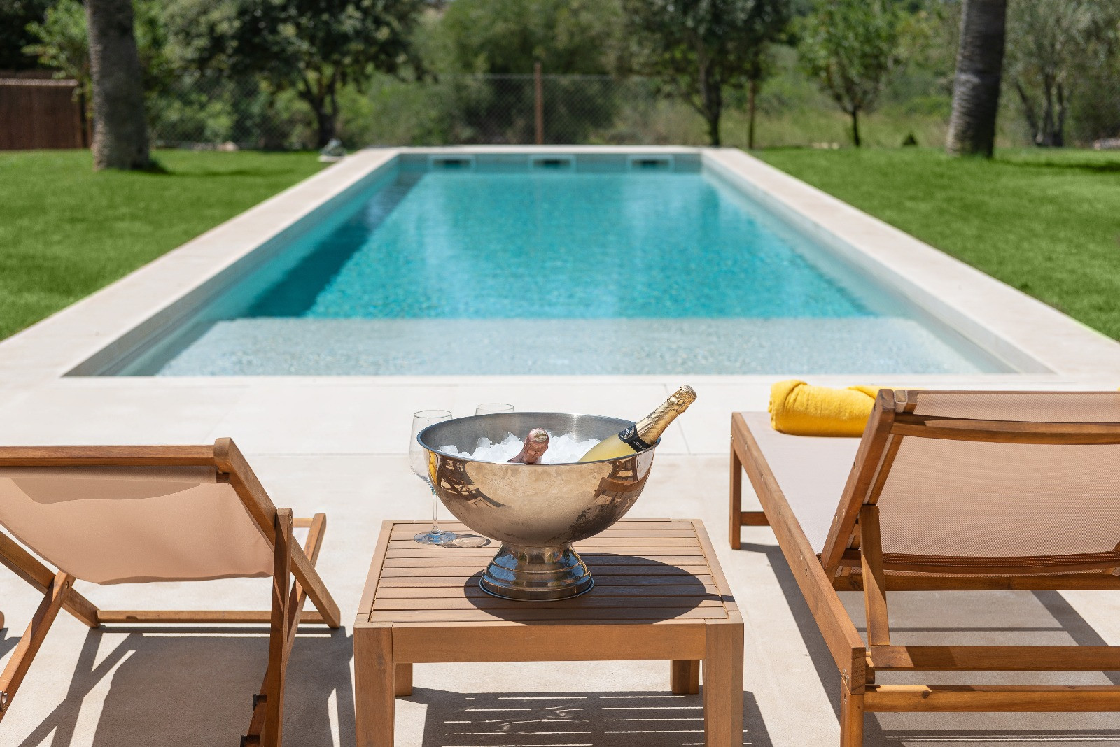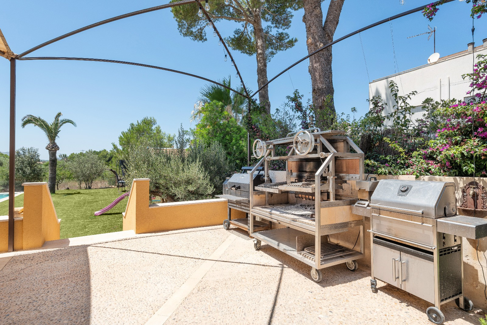 La propiedad destaca por sus amplios exteriores, perfectamente cuidados y pensados para disfrutar al máximo del clima mediterráneo. Dispone de una espectacular piscina privada de agua salada de 16 x 4 metros y 1,6 metros de profundidad, zona infantil con columpios y cama elástica, ducha exterior y cómodas hamacas. La cocina exterior invita a largas veladas al aire libre, equipada con horno, barbacoa y una acogedora zona de sofás para relajarse. Además, cuenta con una gran terraza amueblada de 45 m² y un agradable porche de 15 m². El aparcamiento exterior tiene capacidad para 2–3 vehículos. Cuna y trona disponibles bajo petición.