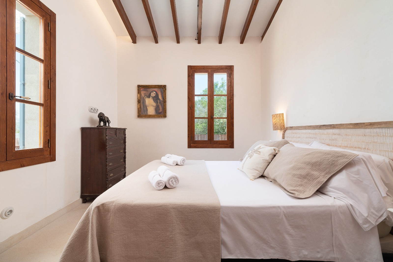 Exclusiva casa de lujo situada en Es Barcarés, una de las zonas más tranquilas y demandadas del norte de Alcúdia, a tan solo 350 metros de la preciosa playa de arena de Es Morer Vermell, una cala de aguas cristalinas y ambiente familiar.