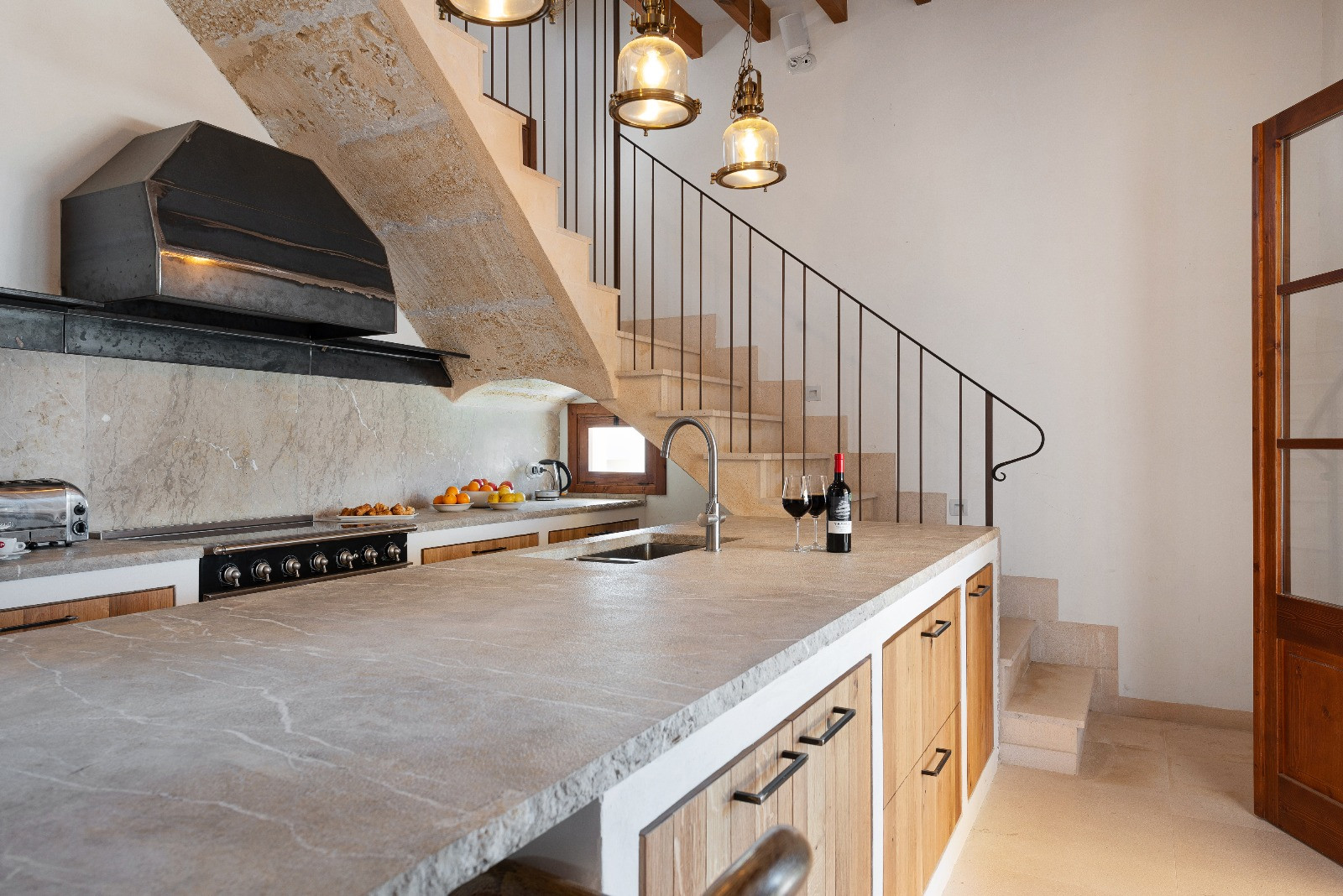 La cocina abierta, con una elegante barra americana, está completamente equipada para preparar cualquier plato: encimera de inducción y de gas, gran nevera-congelador, horno eléctrico, lavavajillas, cafetera de filtro e italiana, además de vajilla y utensilios de cocina.
