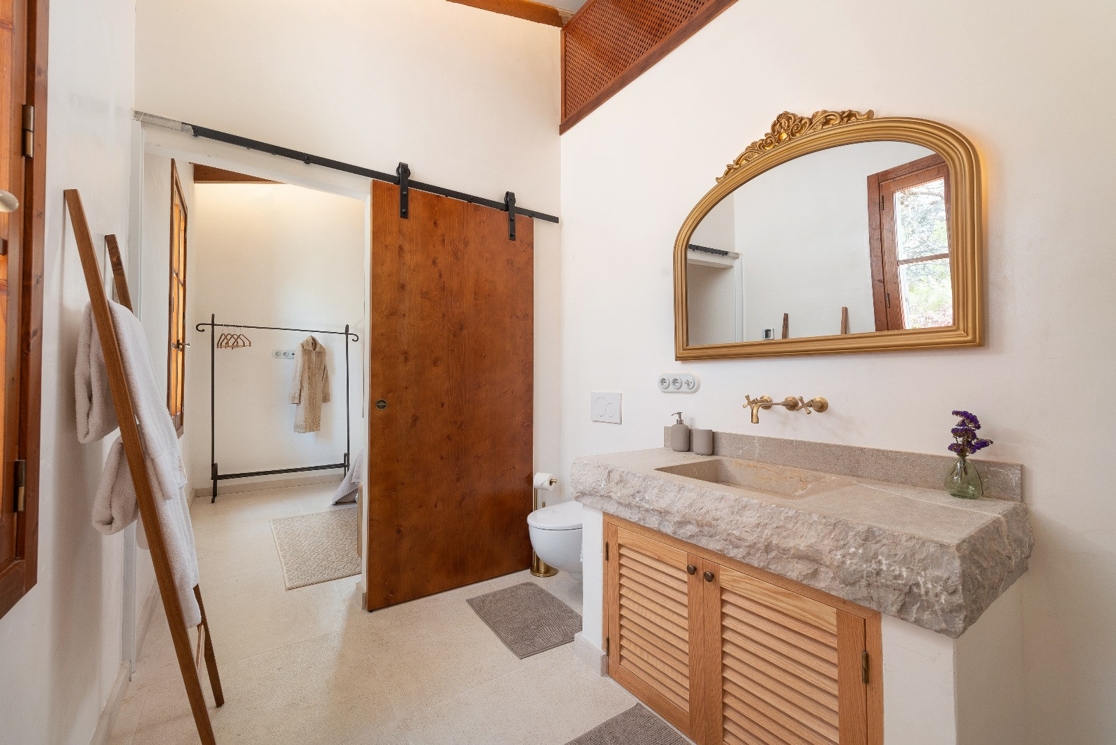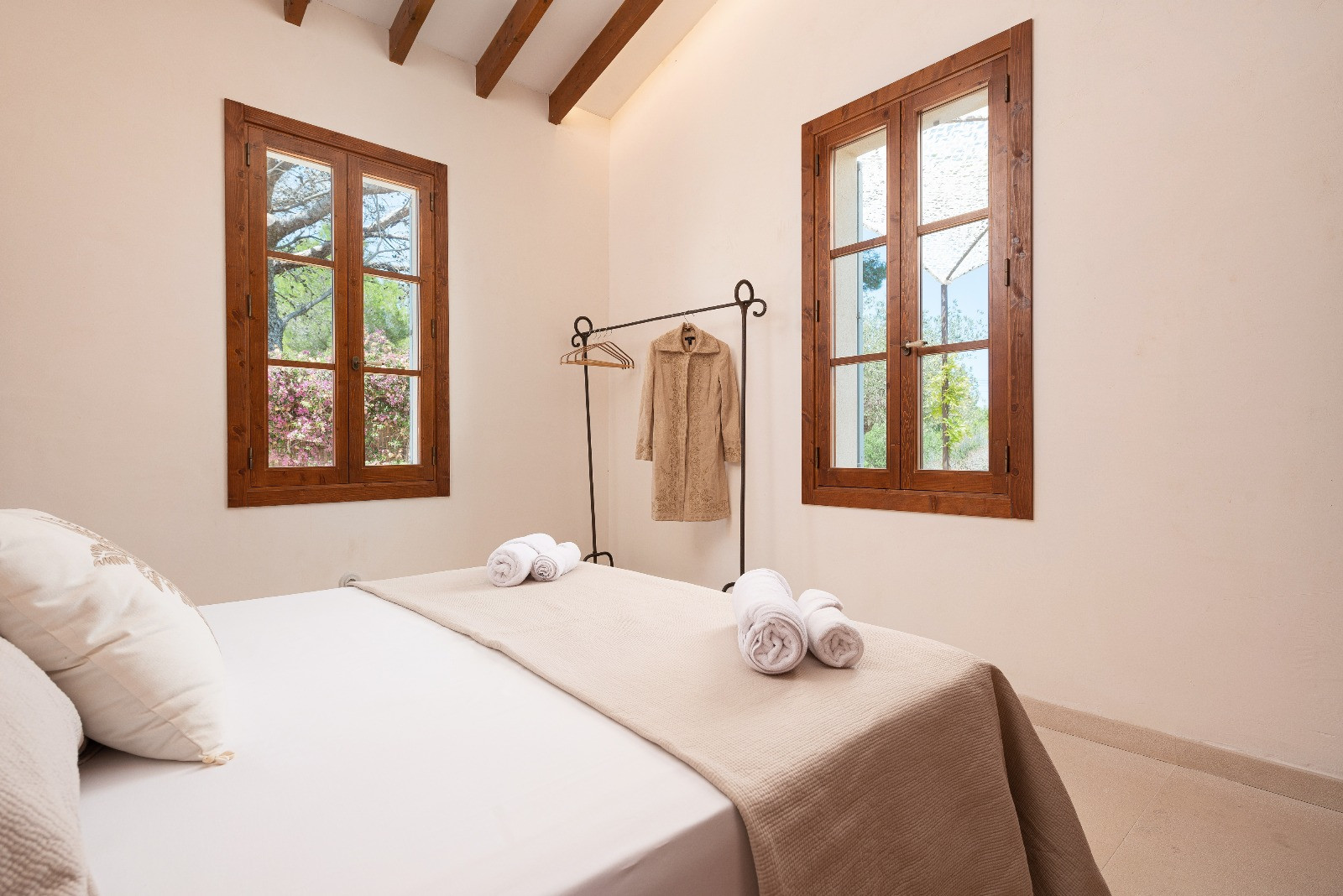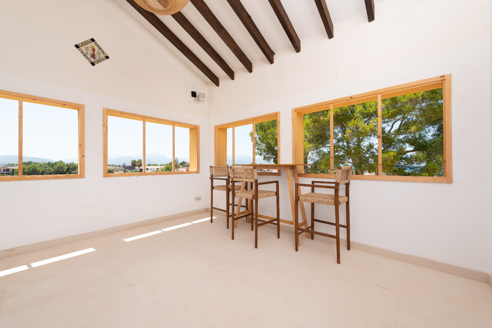 El interior de la vivienda ofrece un estilo moderno, elegante y muy luminoso, con todas las comodidades para una estancia confortable. Al acceder a la casa encontramos un amplio salón-comedor con sofá, aire acondicionado, wifi de alta velocidad apto para teletrabajar y televisión con satélite, incluyendo canales en alemán e inglés. La zona de comedor es espaciosa y acogedora, con sillas y banco.