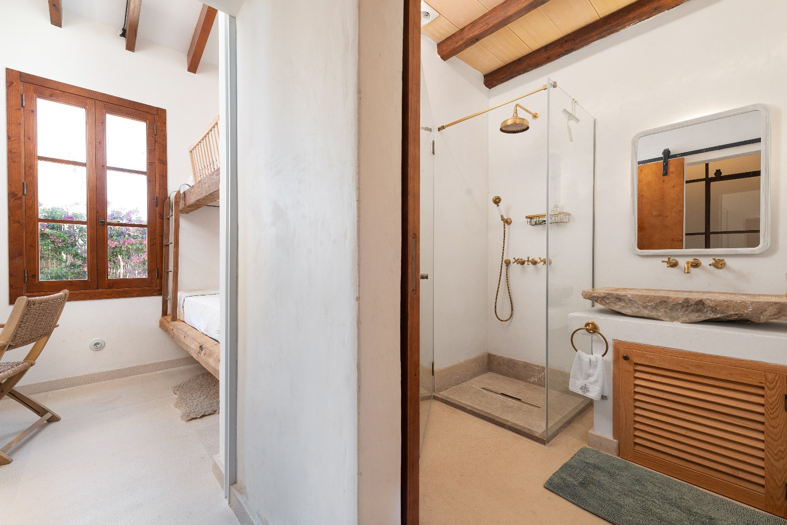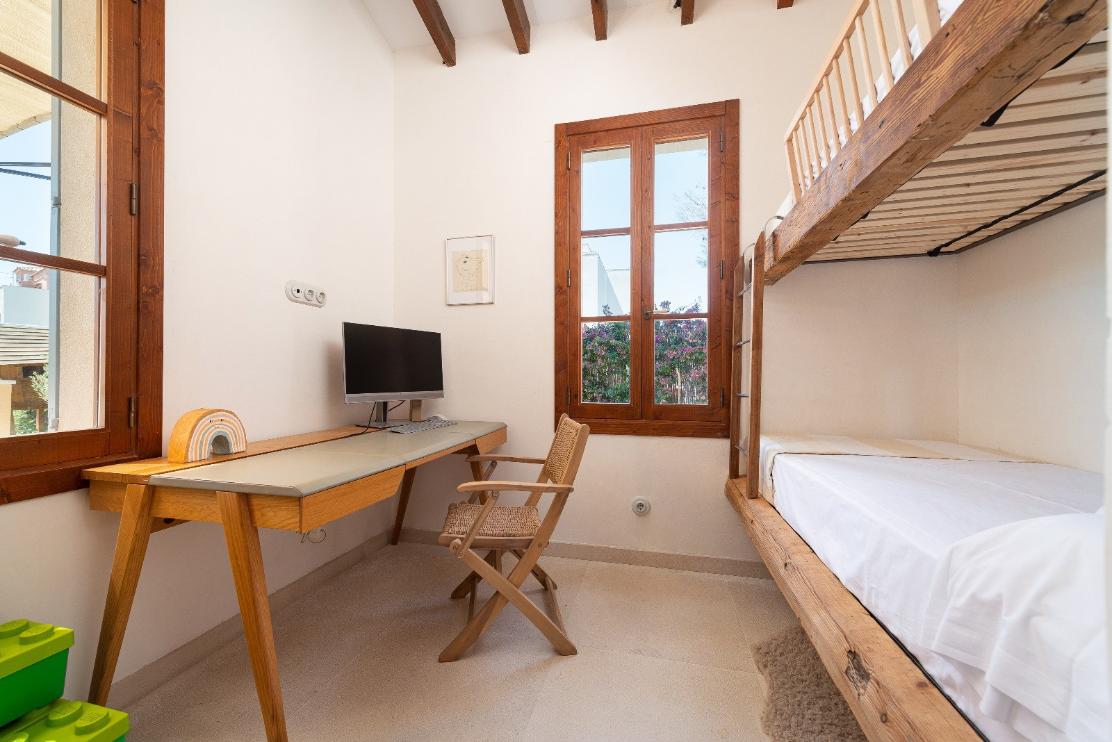 La vivienda dispone de cinco dormitorios con aire acondicionado: cuatro con camas dobles y uno con litera. Uno de los dormitorios dobles cuenta con baño en suite con ducha. Además, hay dos baños independientes, ambos con ducha. En la primera planta se encuentra un segundo salón, ideal como zona de lectura o descanso.