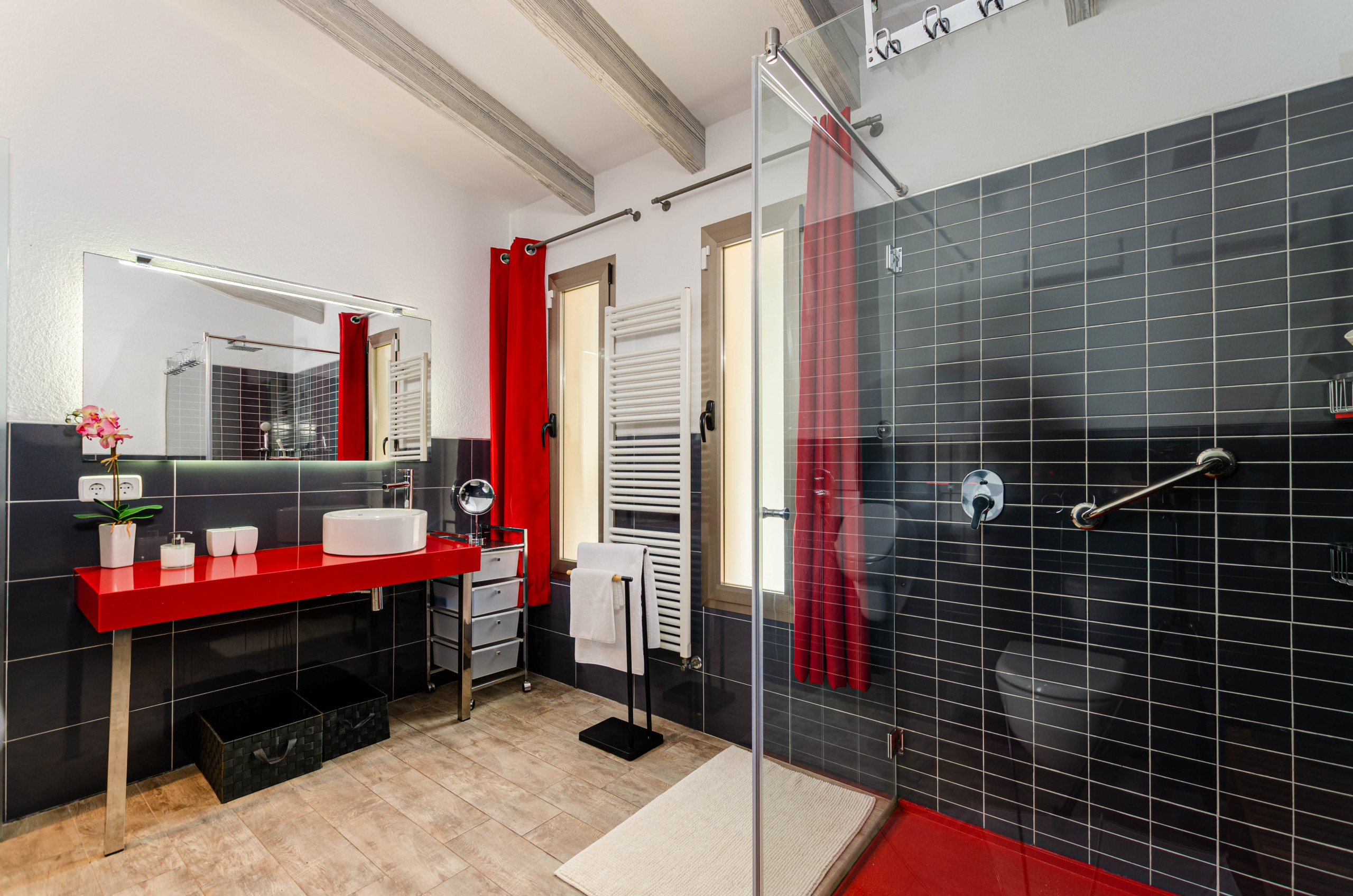 La villa cuenta con 5 habitaciones, todas equipadas con aire acondicionado para su confort. Dos de estas habitaciones tienen cama doble y baño en suite con ducha y secador de pelo. Dos habitaciones adicionales disponen de dos camas individuales cada una, una de ellas también con baño en suite con ducha y secador de pelo. La quinta habitación cuenta con una cama individual y baño en suite con ducha y secador. Además, hay dos baños independientes: uno con bañera y otro con ducha.