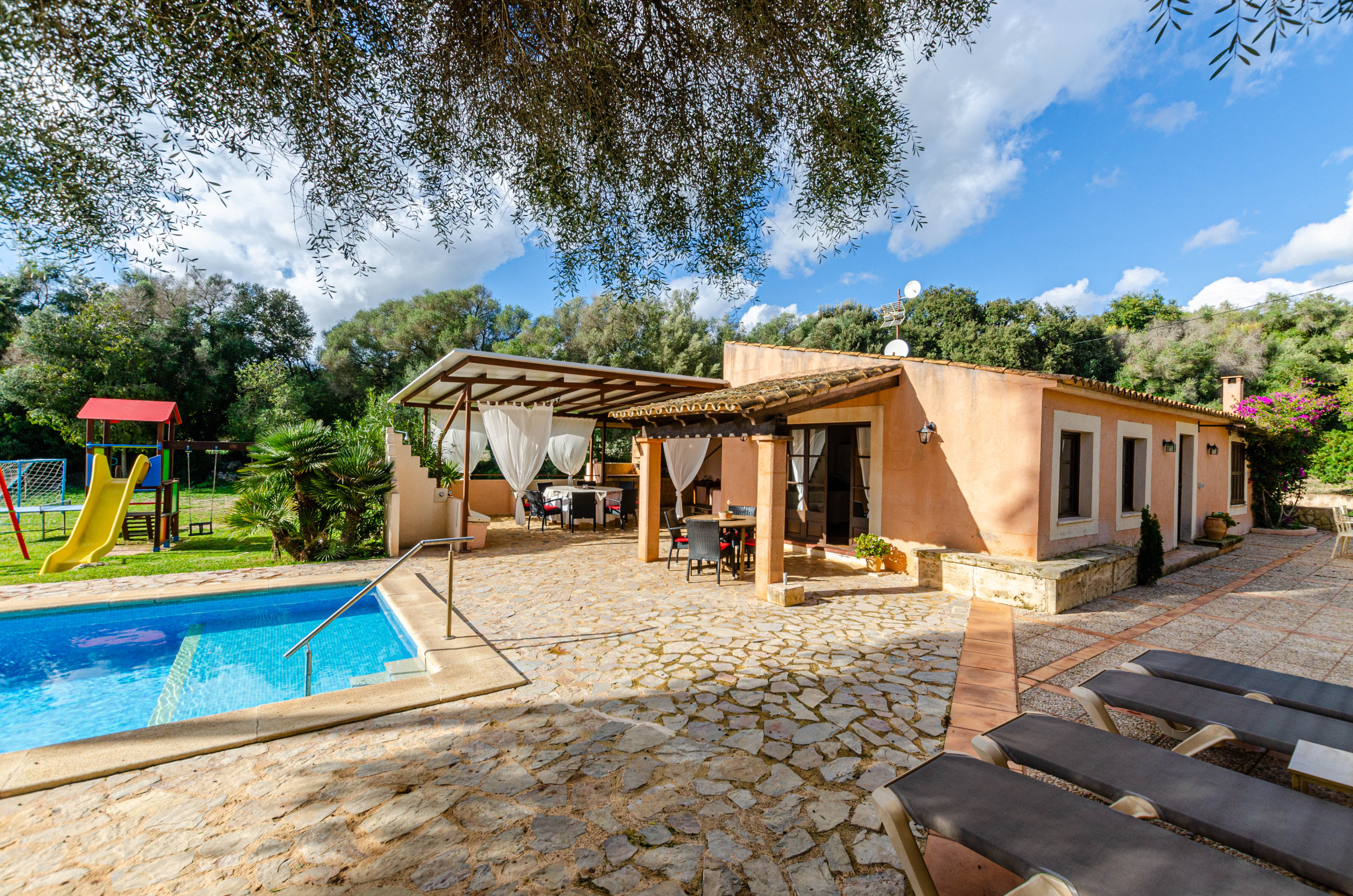 La propiedad cuenta con una piscina privada de cloro de 8 x 4 metros y una profundidad máxima de 2,1 metros, perfecta para refrescarse durante los días soleados. En la zona de descanso, equipada con 10 hamacas y un espacio chill-out amueblado, podrá relajarse y disfrutar de las vistas a la montaña y del entorno natural con árboles frutales, como almendros, higueras y limoneros. Además, se dispone de una ducha exterior, mesa de ping-pong, parque infantil con tobogán y columpios, y una barbacoa de obra para organizar comidas al aire libre. Para su comodidad, se proporcionan toallas de piscina.