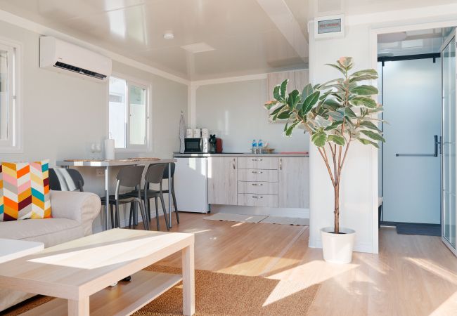 Das Innere ist darauf ausgelegt, Komfort und Stil zu bieten. Ein geräumiger Wohn-Essbereich mit integrierter Küche bietet alles Notwendige für einen angenehmen Aufenthalt, wie eine Küche ausgestattet mit Mikrowelle, L'Or-Kaffeemaschine, Utensilien und vollständigem Geschirr. Im Wohnbereich bieten wir einen Flachbildfernseher mit Satellitenkanälen auf Deutsch, Englisch und Französisch sowie kostenfreies WLAN und Klimaanlage im Wohnzimmer.