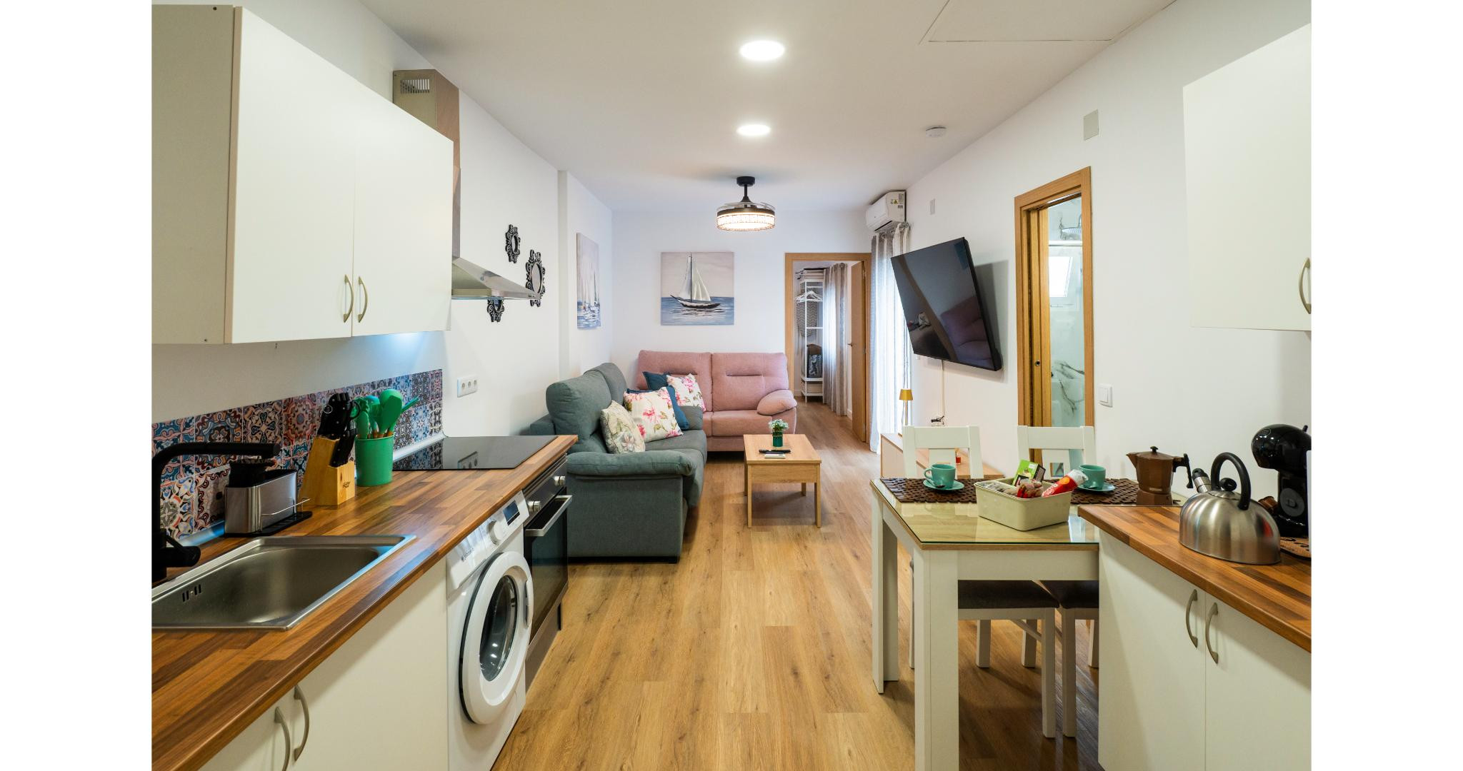 Inside you will find a modern and practical space: integrated kitchen, living room and dining room, with induction hob, fridge, Italian coffee maker and Dolce Gusto, kettle, toaster and complete crockery. The living room has air conditioning, flat-screen TV and WiFi connection. In addition, it has a comfortable sofa bed designed for two children. The main bedroom offers a double bed and also air conditioning, guaranteeing cool and quiet nights. The apartment is located on the first floor without a lift.