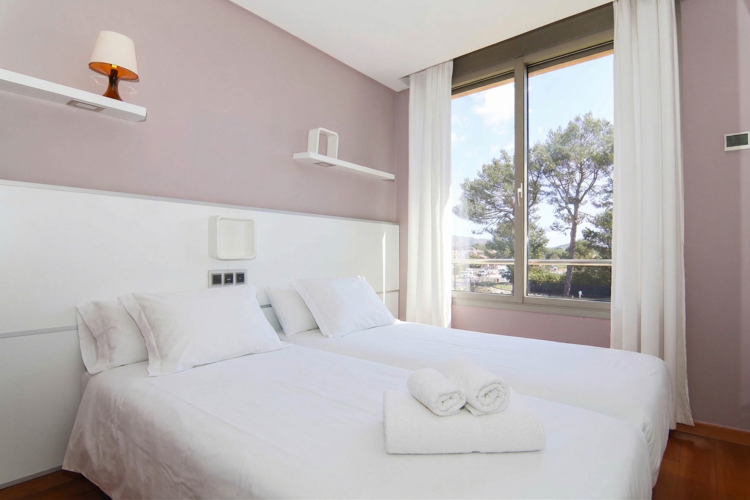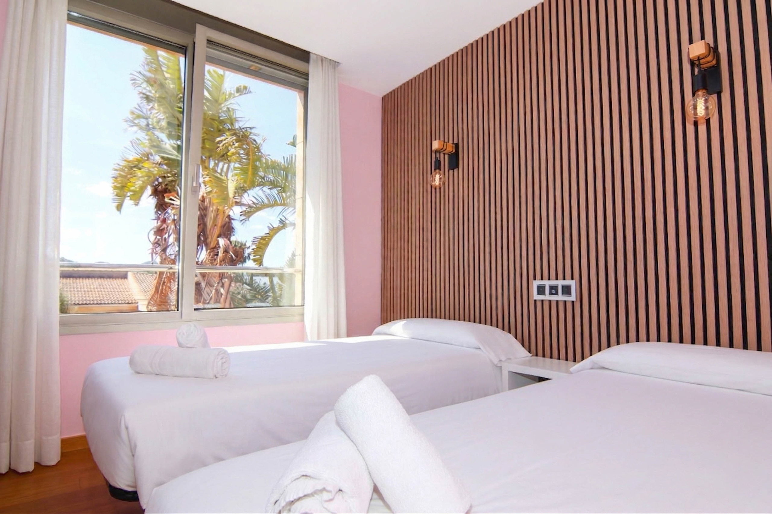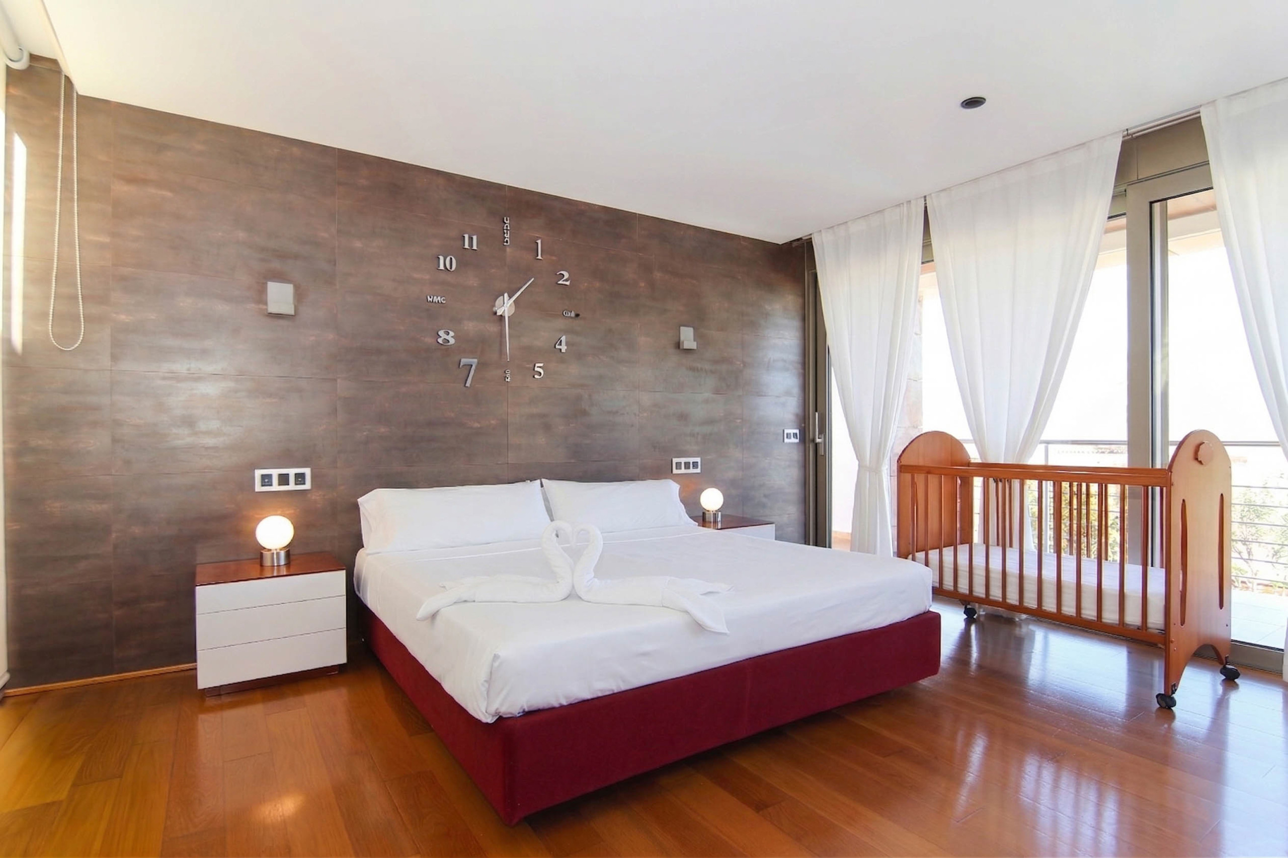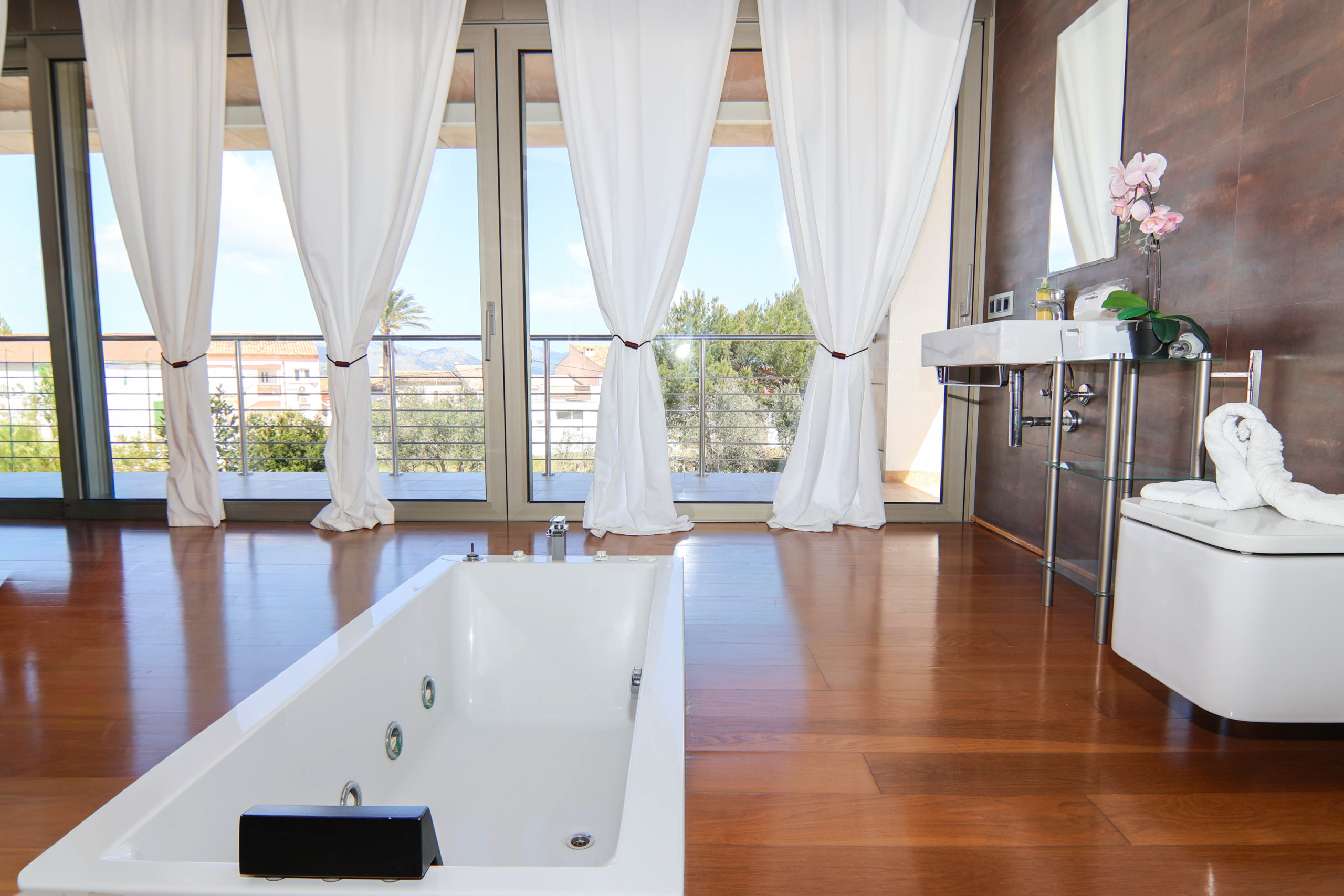 The main suite is impressive. The double bed has views of the sea and the Sierra de Tramuntana. It has double-aspect glass walls that provide access to a balcony.