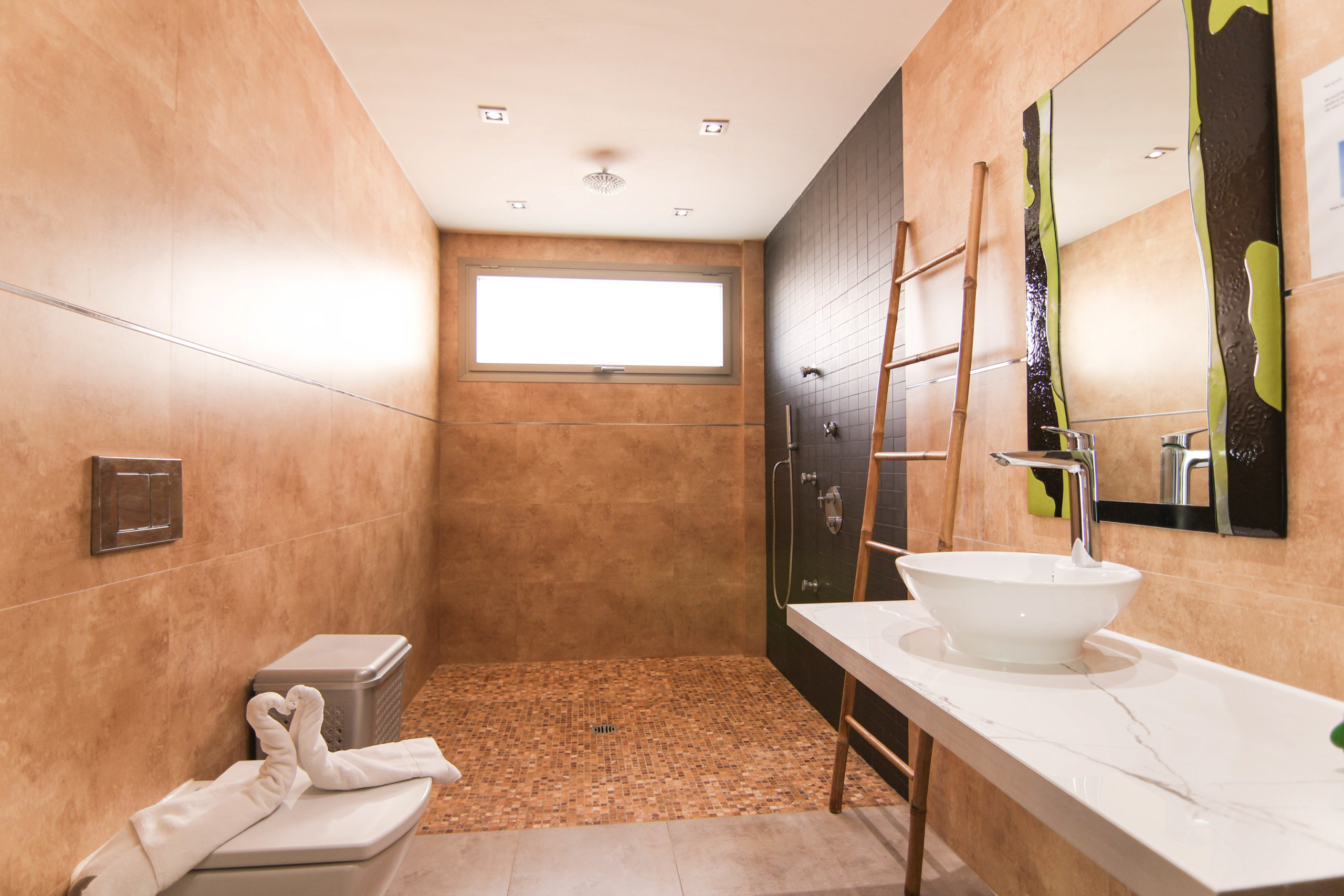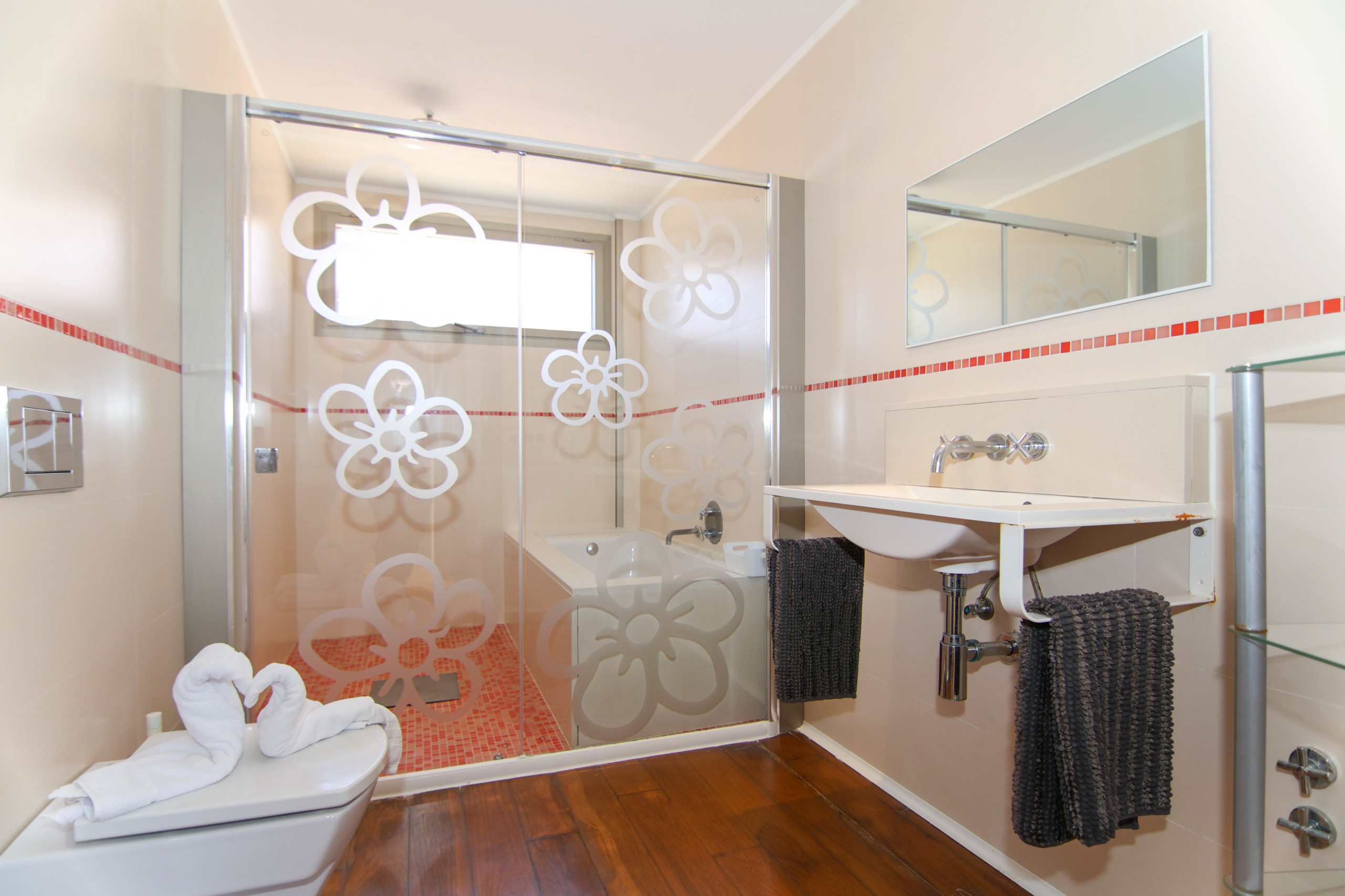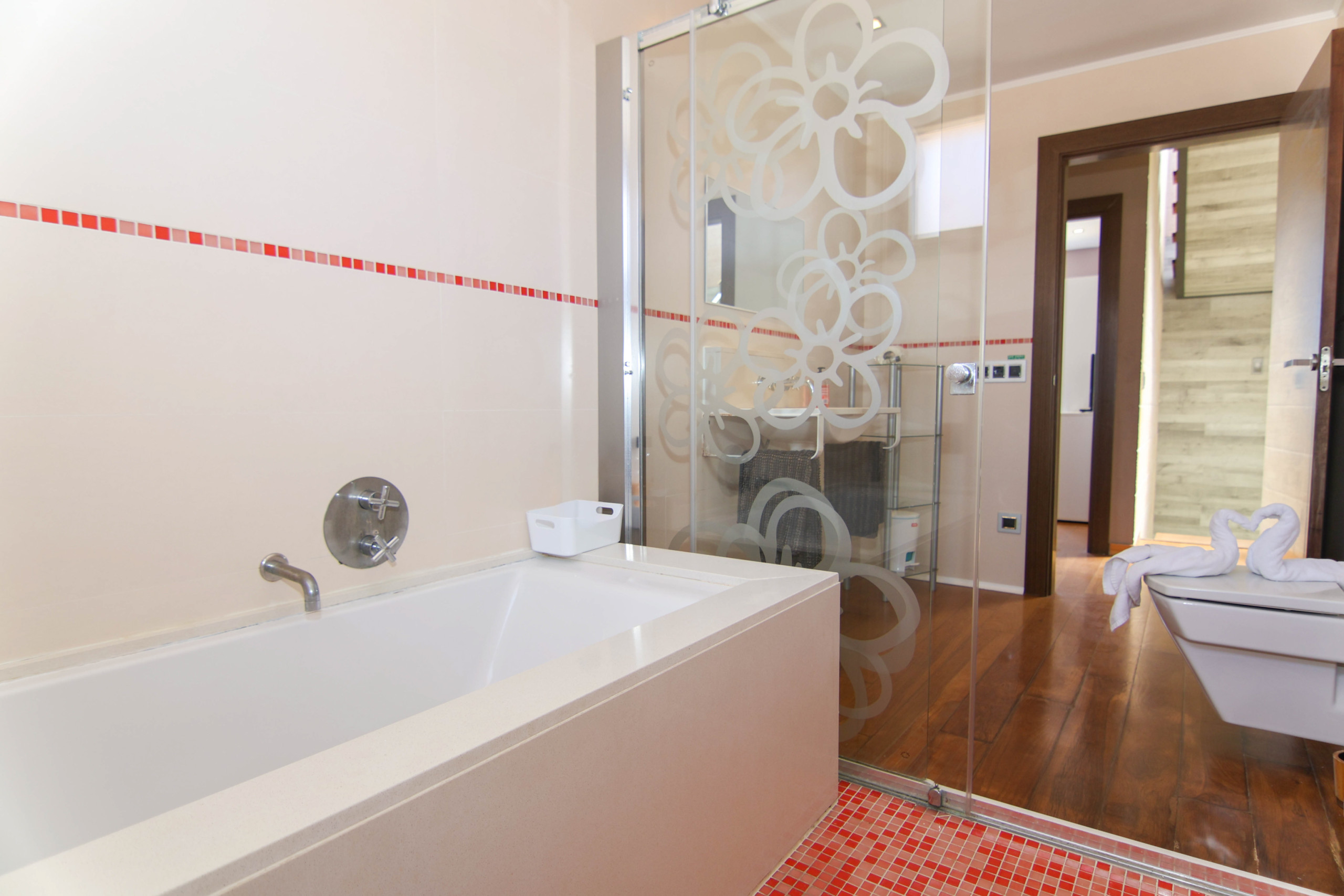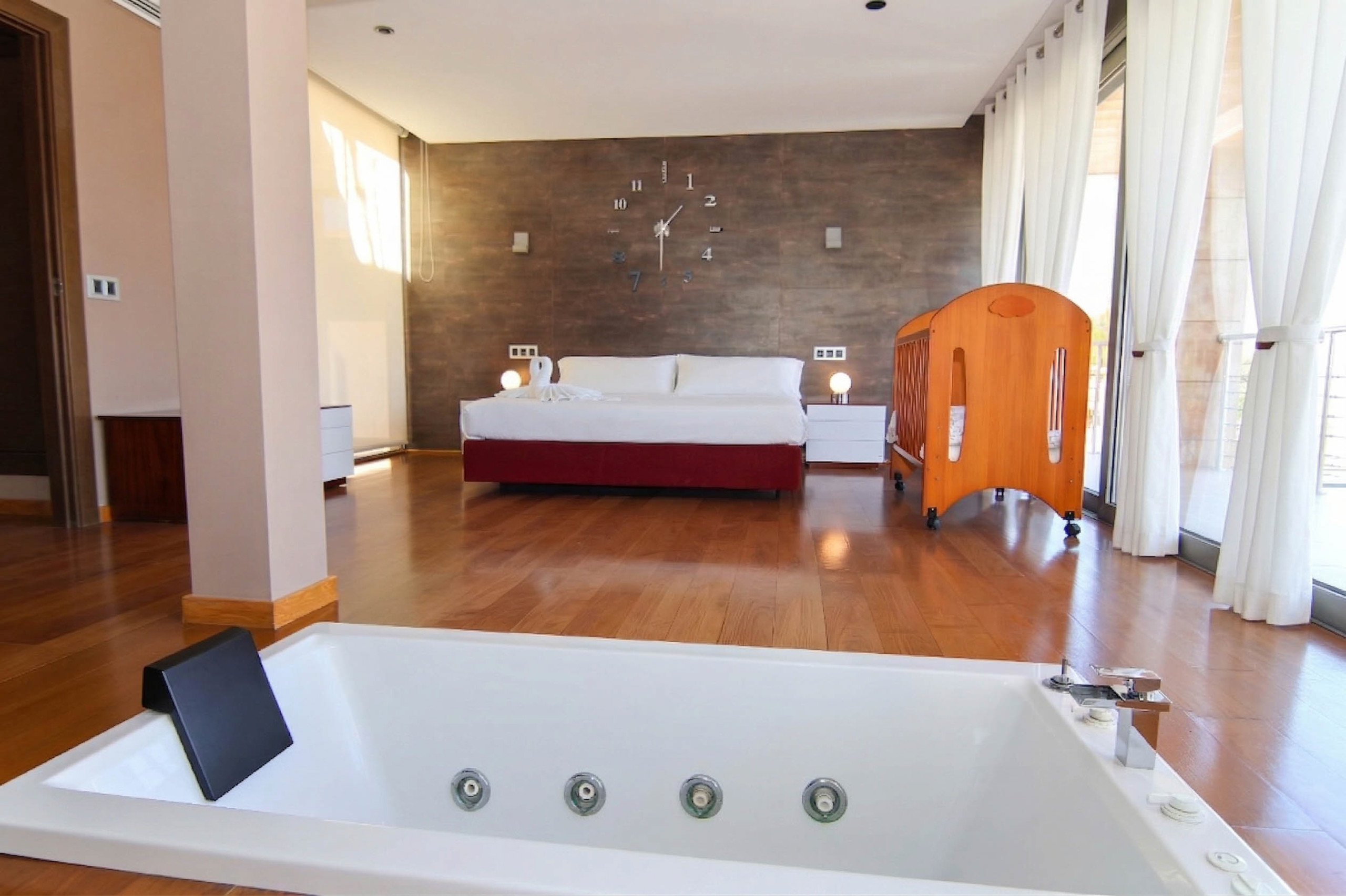 There is an enormous en suite bathroom and a walk-in wardrobe. It is dominated by a large sunken bathtub that has views of the sea through the floor-to-ceiling glass doors that provide access to a balcony.
