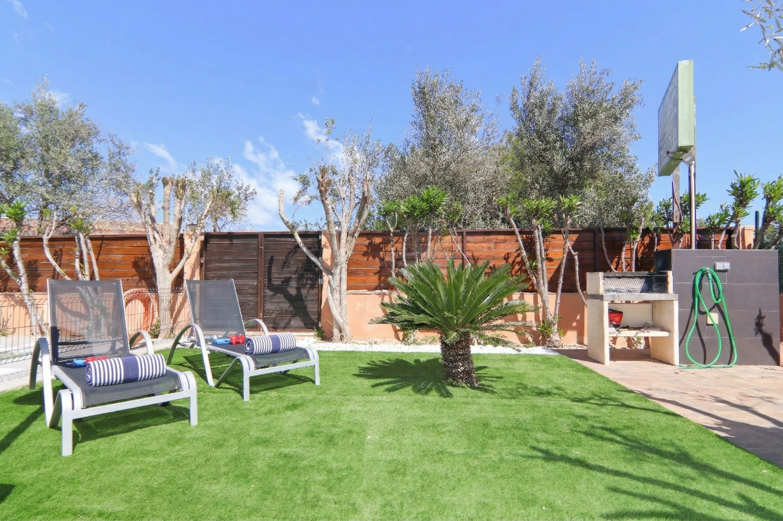 There is a secure parking area at the front of the property. The back garden houses a closed swimming pool with a safety fence for the protection of young guests. There is an outdoor dining area under a shaded gazebo. Nearby is a brick barbecue in the shade of an old olive tree.