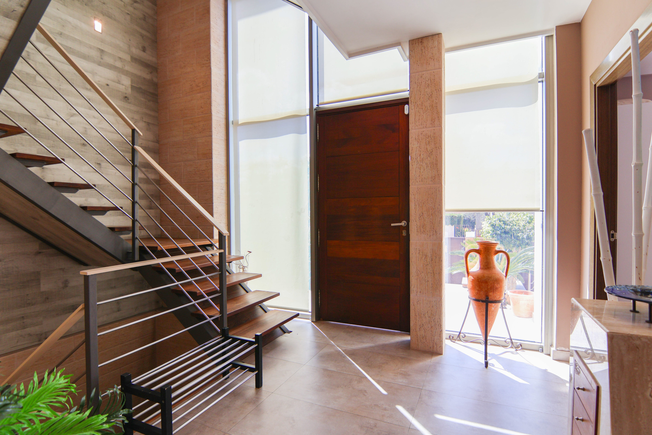 Access to the villa is through a two-storey lobby with a characteristic wall and an open-plan staircase.