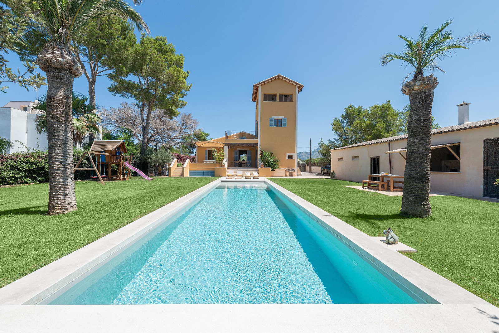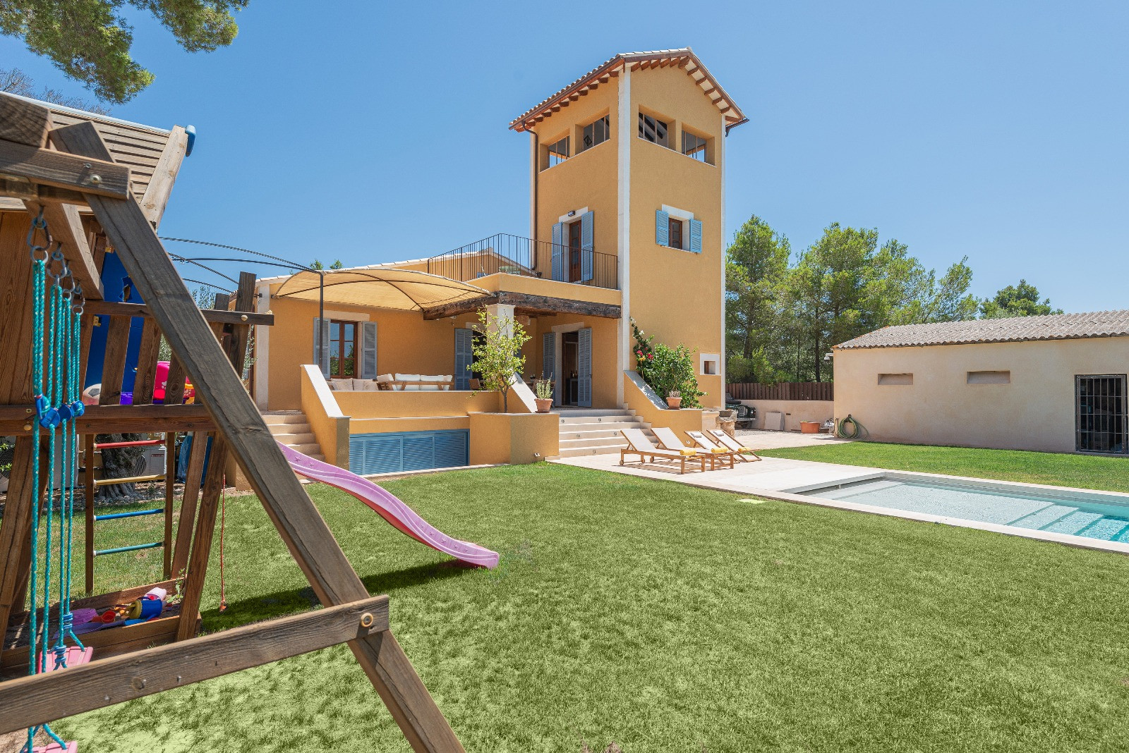 The property stands out for its spacious exteriors, perfectly maintained and designed to fully enjoy the Mediterranean climate. It features a spectacular private saltwater swimming pool measuring 16 x 4 metres and 1.6 metres deep, a children's area with swings and a trampoline, outdoor shower and comfortable sun loungers. The outdoor kitchen invites long evenings outdoors, equipped with an oven, barbecue and a cosy sofa area for relaxation. Additionally, it has a large 45 m² furnished terrace and a pleasant 15 m² porch. The outdoor parking area has capacity for 2-3 vehicles. Cot and high chair available upon request.