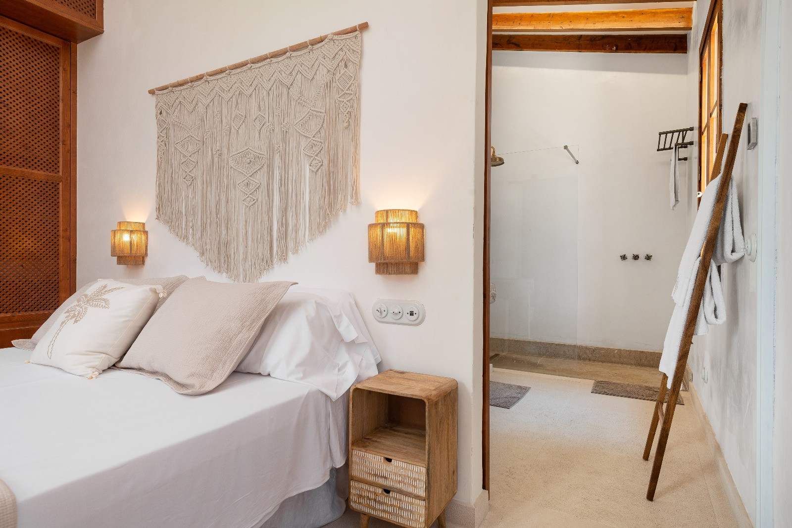 The property has five air-conditioned bedrooms: four with double beds and one with bunk beds. One of the double bedrooms has an en-suite bathroom with a shower. Additionally, there are two independent bathrooms, both with showers. On the first floor, there is a second living room, ideal as a reading or relaxation area.