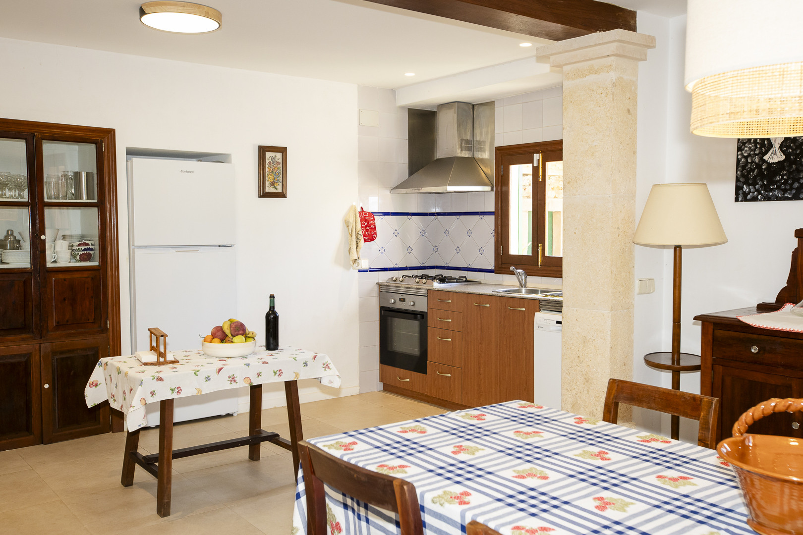 The cozy interiors welcome you with a dining area where the whole family can sita round the table. The fully equipped kitchen comes with an induction hob, oven and dishwasher, amongst many other items. The living area includes a cozy sofá and a fireplace and there’s a second living room for our guests.