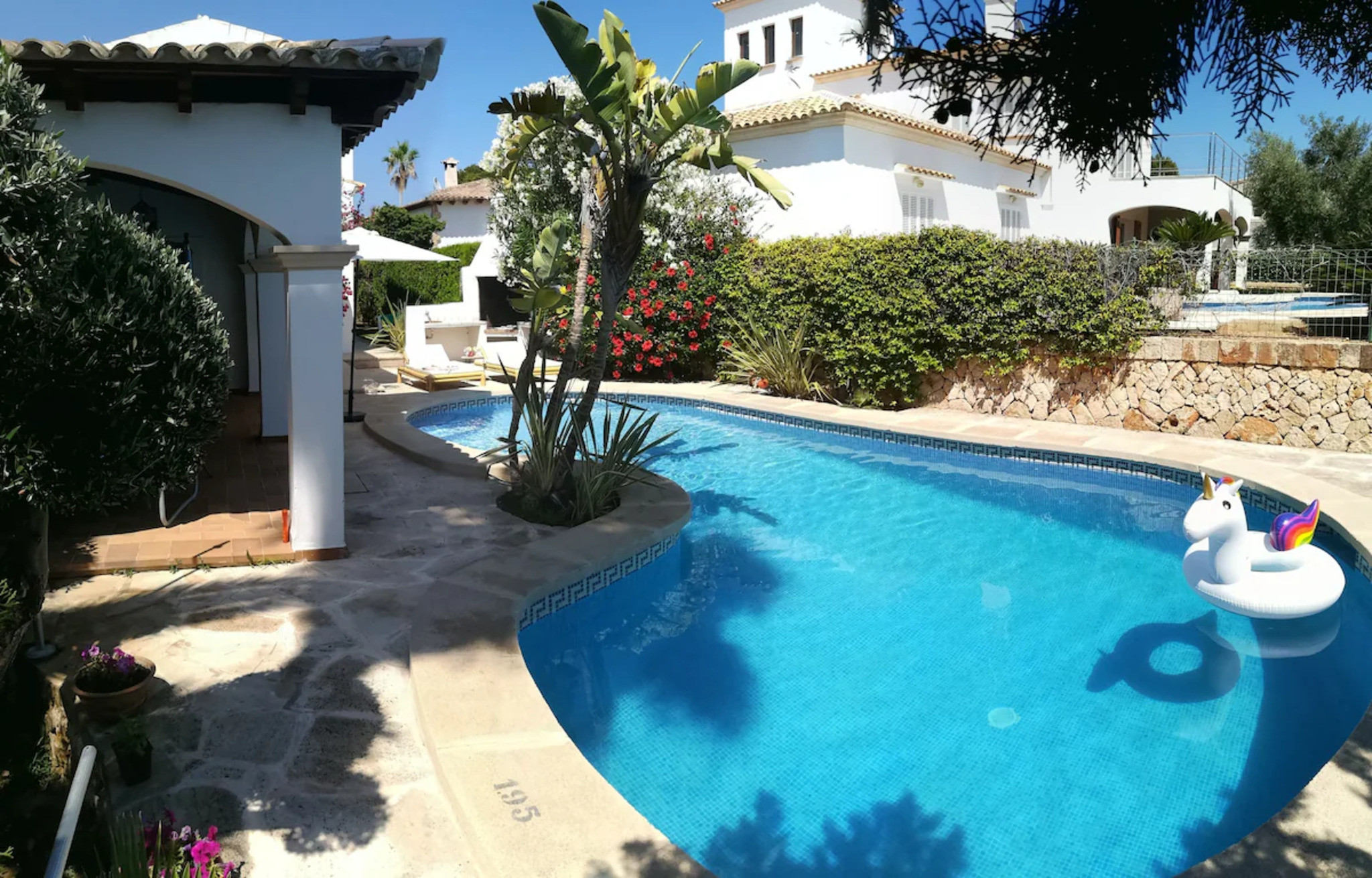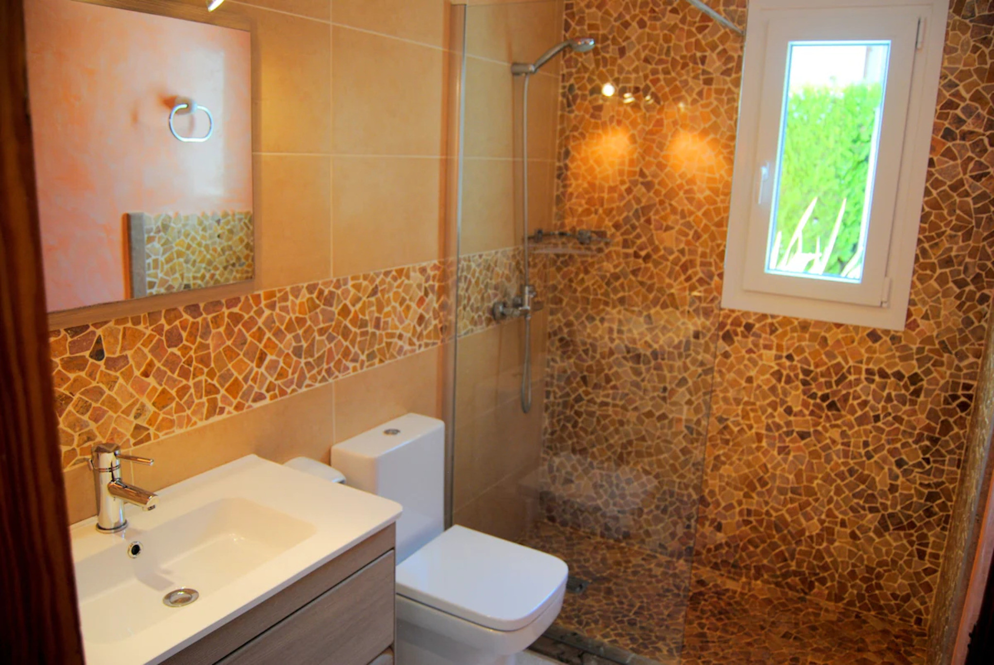To the right of the living room is a bedroom with two single beds with direct access to the terrace and the pool and a bathroom with bathtub. On the other side of the house are the other two bedrooms. One double bedroom with two single beds and an en-suite bathroom with shower. The other bedroom has a double bed with en suite bathroom and also direct access to the terrace and pool.